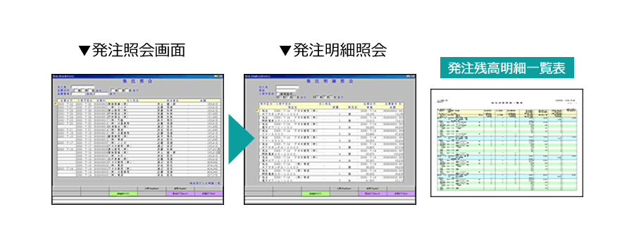 発注残数量は発注したが未だ仕入されていない(入荷していない)状態の数量を表します。その発注残情報を仕入先別や入荷予定日別に画面に表示することができます(発注照会画面)。また、入荷予定日別の一覧表を印刷することも可能です。これで、正確な発注管理を行うことが出来ます