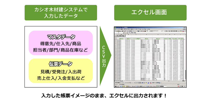 カシオ木材建材システムで入力した得意先・商品の一覧表や取引データそのものを、簡単操作でエクセルに出力できます!これで、二度打ちする手間も省けます。また、データはCSV形式で保存できるので、エクセルで変換した後は、データをFD、CD、USBなどに保存し、分社している営業所、工場や、外出先でも操作が出来ます。もちろん、CSV形式で保存したデータはメールに添付し、送信することが出来るので、送信先でデータを確認、操作することも可能です。これにより、データの使用可能な範囲が広がり、効率的に仕事を進めることが出来ます!