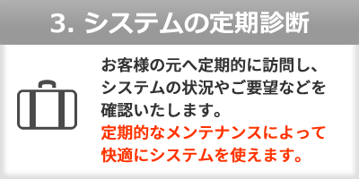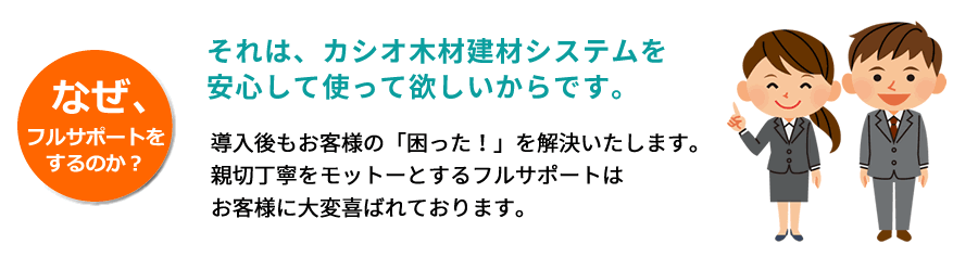 カシオ木材建材システムは導入した会社の事務の流れに合わせてシステムを構築します。この点が「使いやすい木材建材システム」とご評価をいただいている最大の理由です。ところが、お客様を取りまく状況は変化し、伝票の仕様や事務処理の流れも変わります。すると導入した木材建材システムが「使いやすい木材建材システム」とは言えない状態になるかもしれません。お客様の変化に対応し「いつまでも使いやすいシステム」として喜んでお使いいただけるように私ども東洋通信はサポートをしてまいります。そのため営業エリアは、私どものサポート・サービスを提供できるエリアに限定させていただいております。